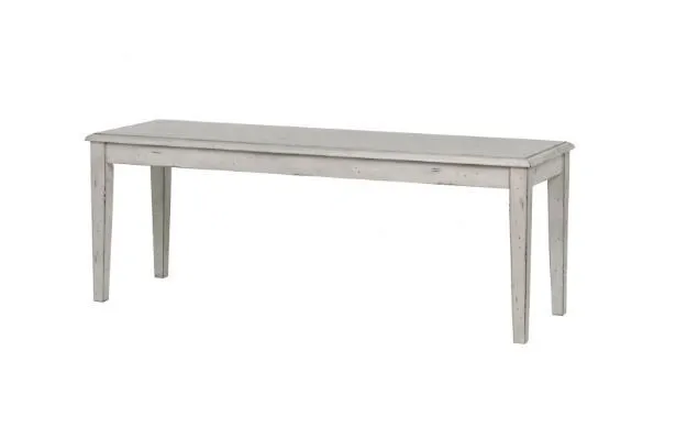 Highland 48" Bench (DH4455): Two-tone vintage style in Brown oak veneer and Antique White solid hardwood. Seating for 8 at the 96 in pedestal table or cozy seating for 6 at the 66 in pedestal table. Cushioned chairs and solid wood bench seating. Solid hardwood, 48W x 15D x 18H, Seat: 48"W x 15"D x 0.75" thickness, Legs: 1.75"W x 1.75"D x 17"H
