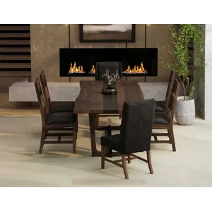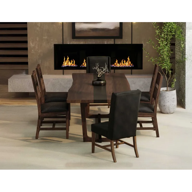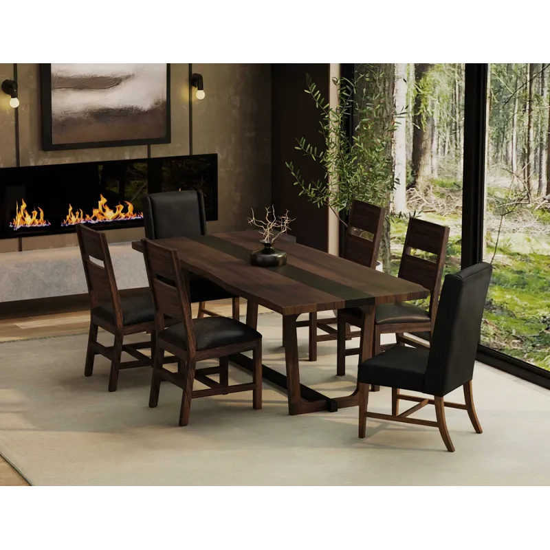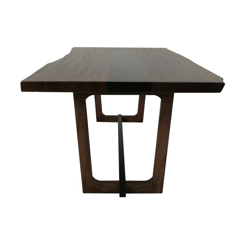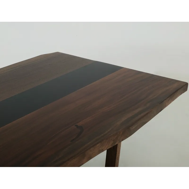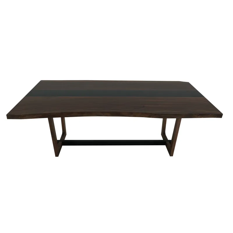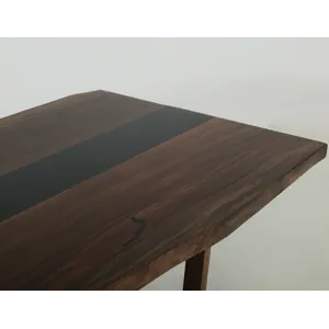 - The Riverwood table, meticulously crafted from beautiful parota wood, is a stunning centerpiece that perfectly blends nature with contemporary design. It features a striking central epoxy resin strip that flows through the wood's natural live edges, enhancing its organic appeal while adding a modern flair. The trestle base is made from mango and Melina wood and is designed for exceptional sturdiness and ample legroom. The table is finished with a translucent, multi-step lacquer that highlights the captivating interplay of rich brown and deep black tones, making it a striking addition to any dining space. Whether you are hosting an intimate family dinner or a lively gathering of friends, the Riverwood table is where lasting memories are created and cherished. More than just a piece of furniture, it truly serves as the heart of your home.