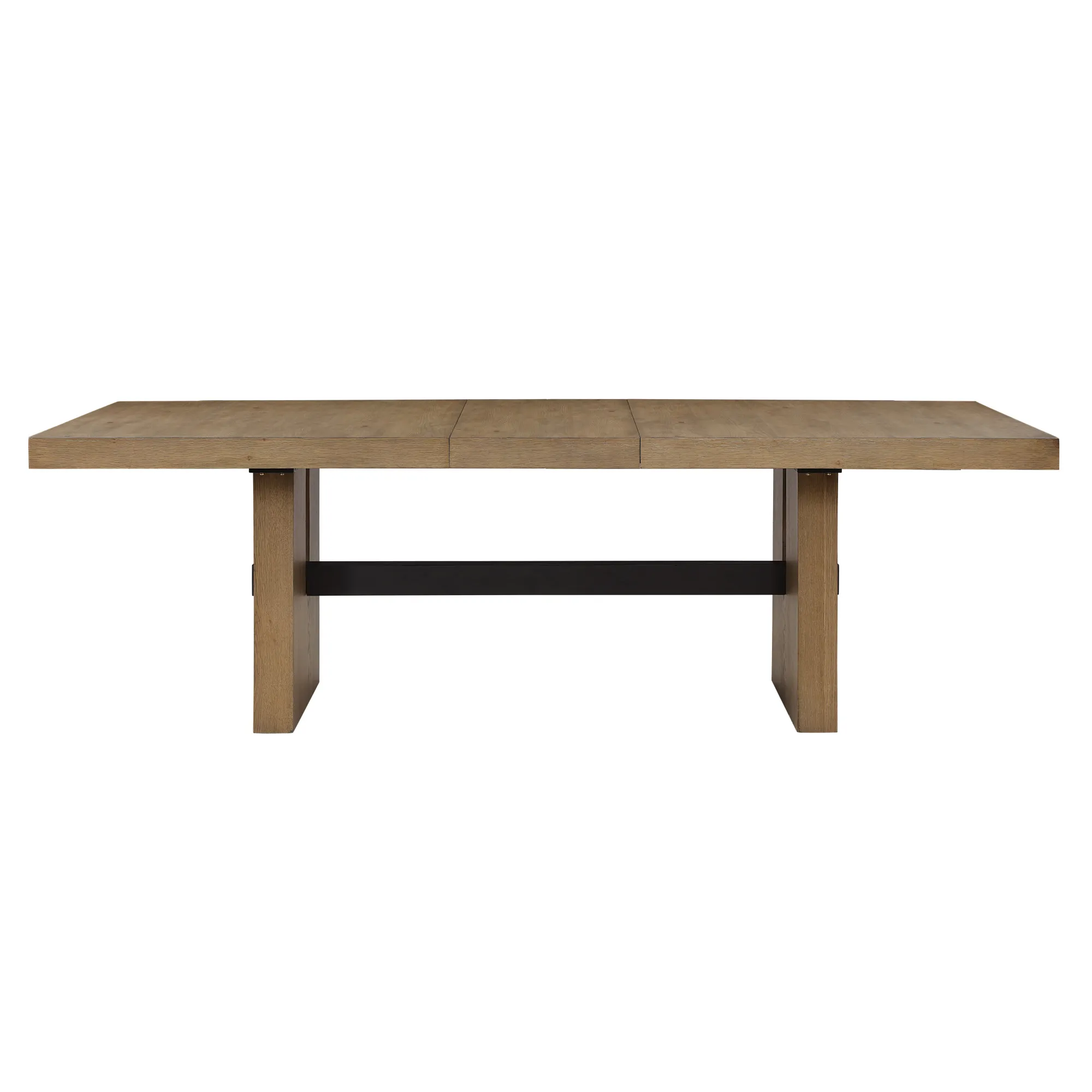 The Aubrey 78-96 inch dining table with an 18-inch leaf emanates modern lodge vibes, boasting clean lines and craftsman influences. Its sleek waxed driftwood finish exudes a contemporary allure, accentuated by ebony-finished stretchers with exposed tenons, allowing for effortless mix-and-match styling with other ebony pieces. Transition seamlessly from intimate gatherings to inclusive feasts with the simple insertion of the 18-inch leaf, expanding the table from 78 to 96 inches in a snap. Instantly accommodate up to ten people, ensuring ample space for memorable dining experiences with family and friends.