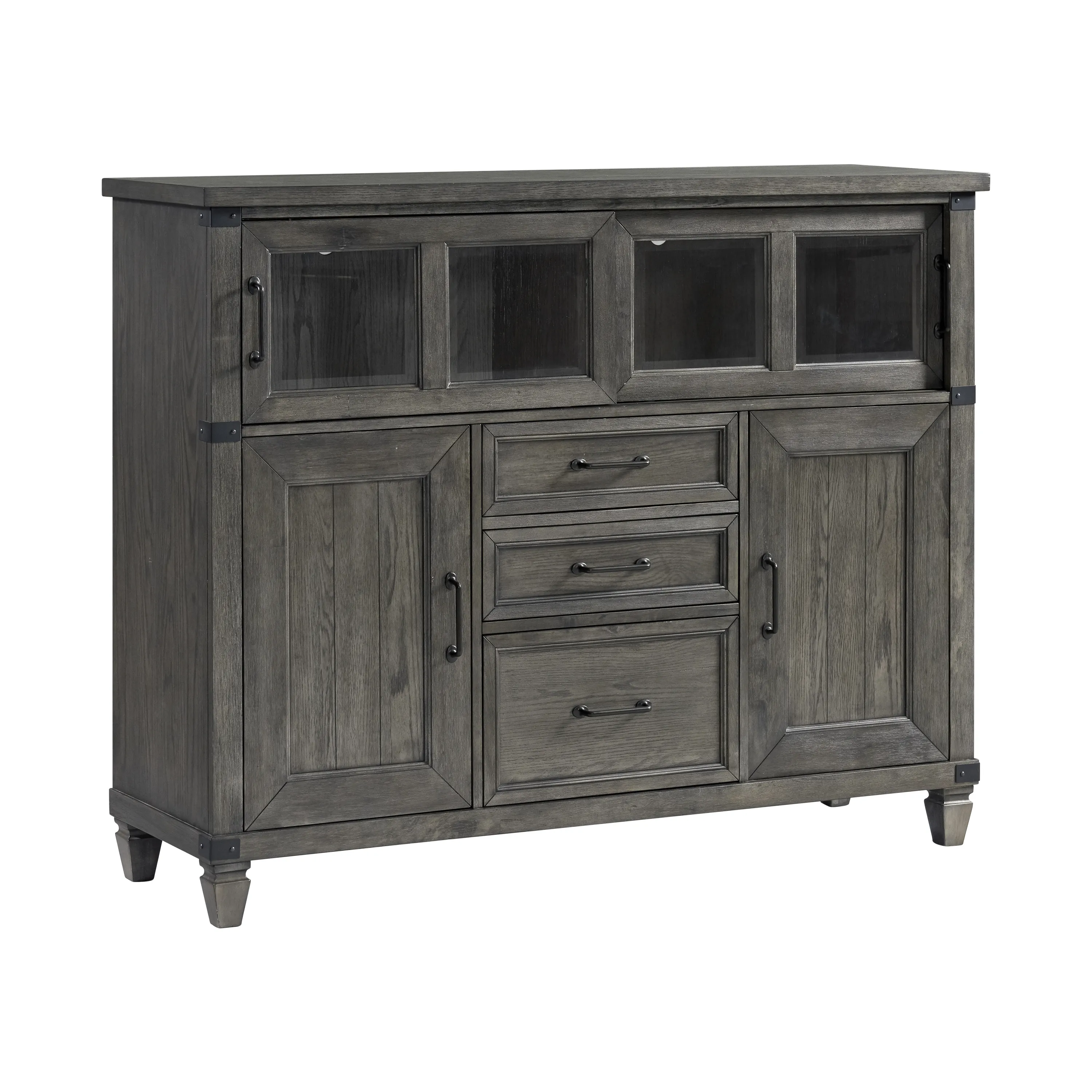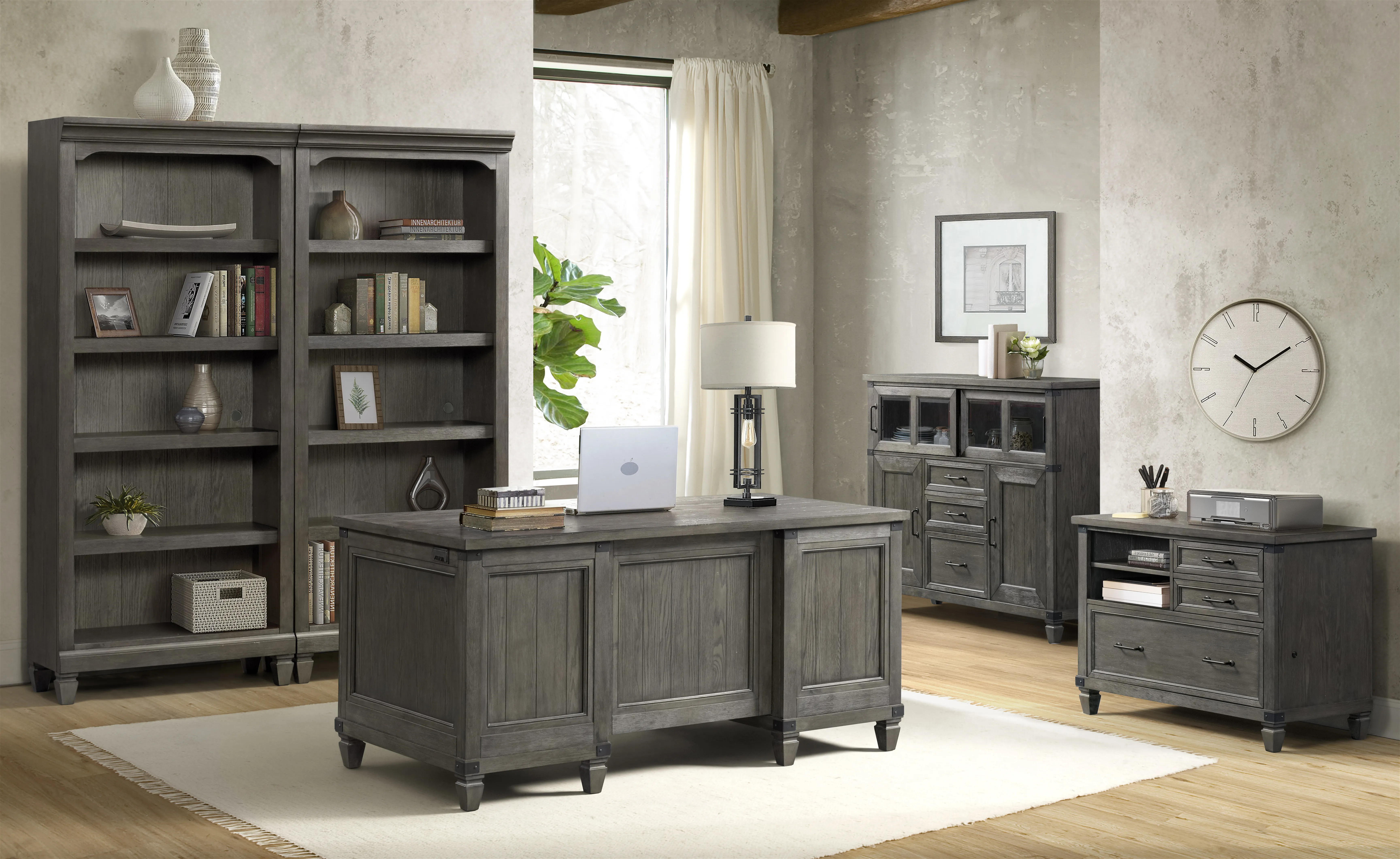 The Foundry Home Office Collection is offered in a wire-brushed Pewter Finish for a natural; rustic appeal. Constructed from Oak Veneer and Select Hardwood