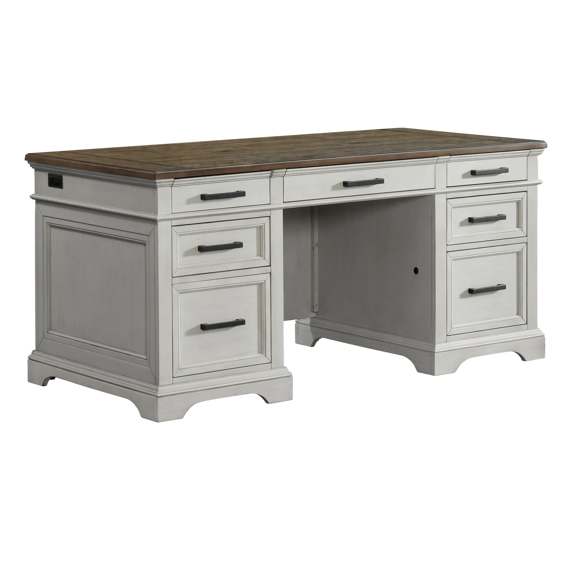 Drake Home Office offers a classic old world style, all case pieces have rustic oak plank board tops. This two-toned finish combines a relaxed antiqued white finish with warm rustic oak patina. Solidly constructed and designed to function the way we work today.