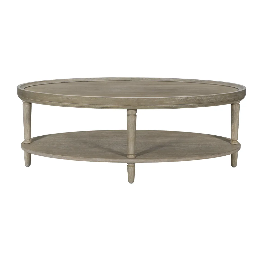 Experience sophistication with the Ayanna Oval Coffee Table from Martha Stewart’s Bedford Collection. The oval shape not only adds a touch of elegance but also ensures smooth lines and flow in your living space. Coupled with a distinctive raised edge, it's designed to keep items secure and prevent them from falling off. This classic farmhouse piece, in a reclaimed Greige finish and elegant turned legs, seamlessly marries style and function. It features fixed shelving and adjustable levelers for optimum utility. Easy assembly with tools included. Add a touch of refined curvature to your decor!