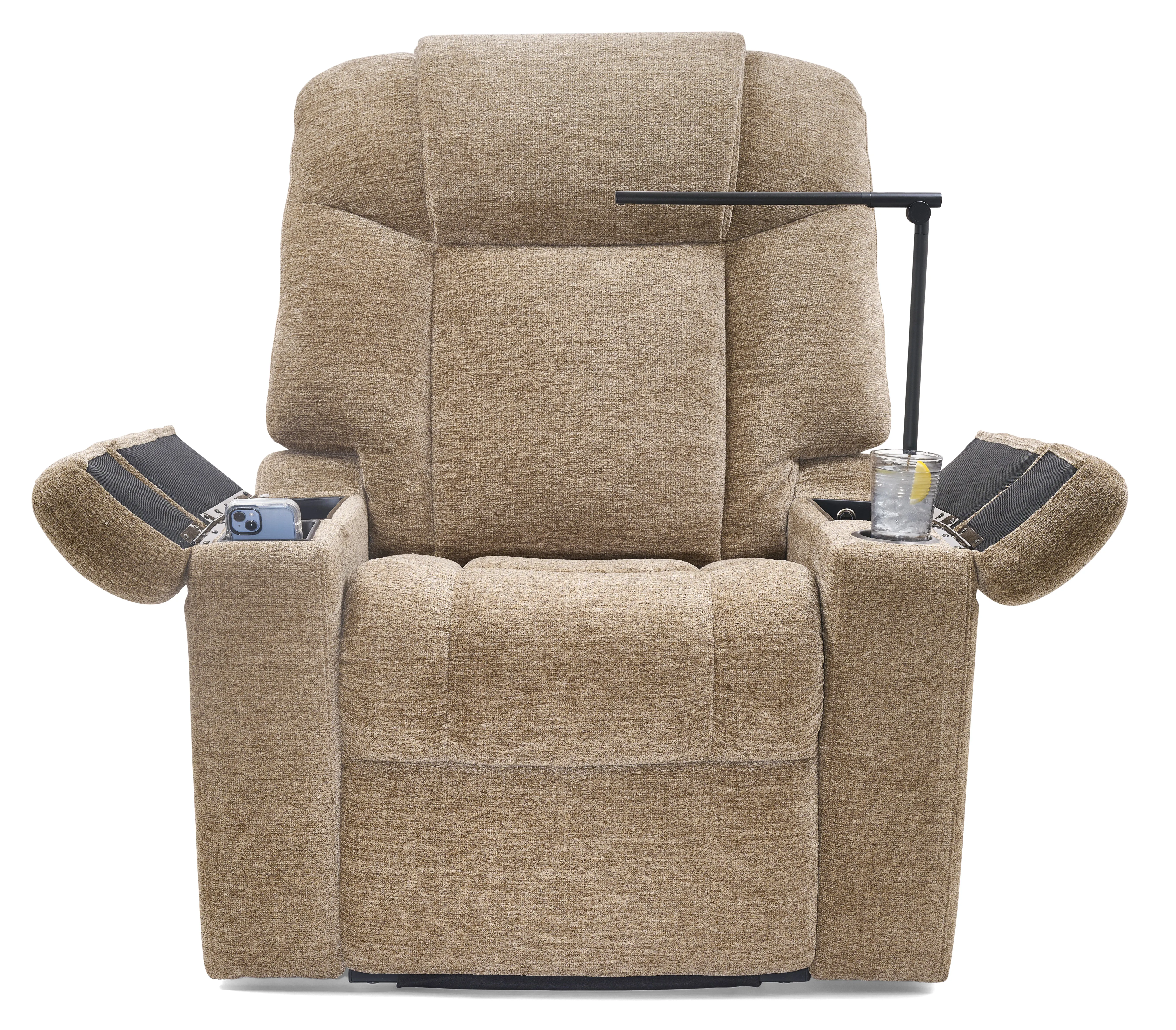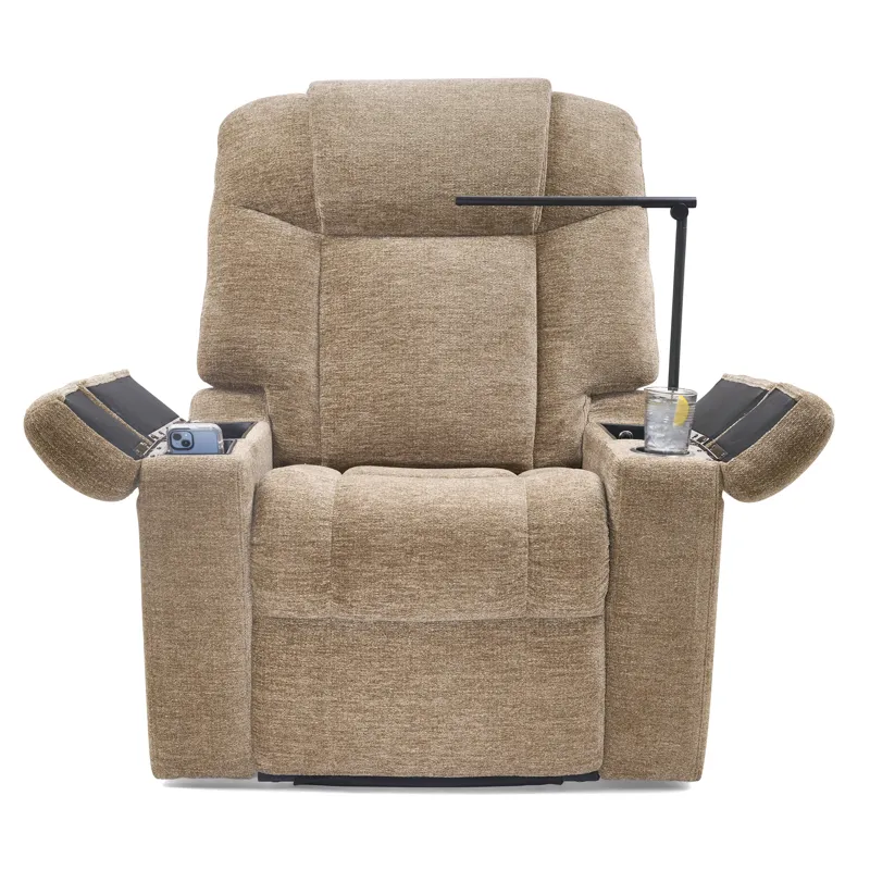 The Venice is designed for total relaxation. This chair features a generously padded seam back, plush chaise pad, and a sleek open-arm design that includes a built-in cup holder, hidden storage, a power port with a removeable reading light and tray table, a wireless phone charger, and a USB port – all within arm’s reach