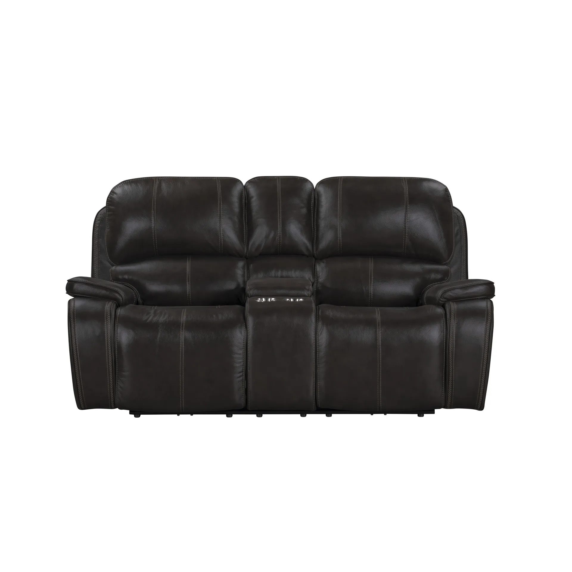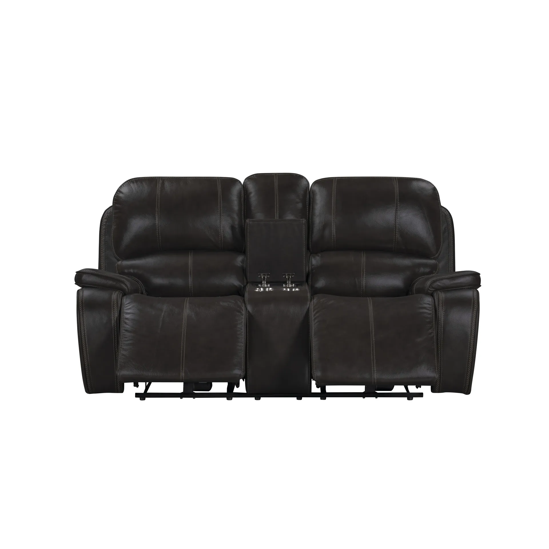 Indulge in comfort and style with the Brookings Dual Recliner Console Loveseat in charcoal gray. Upholstered in a leather-look polyester/pu fabric, this loveseat offers the luxurious appearance of real leather without the premium price. Tailored to perfection, with pillowed arms and double stitched racetrack arms, it boasts distinctive baseball contrast stitching on the bucket seats and plush backrests, making it a standout addition to any room. Relax and unwind with the fully upholstered chaise recliner footrest, supported by durable hardwood and manufactured wood frames with coil spring cushions wrapped in resilient foam and polyester. Convenient lifestyle features include a handy center console for remote storage and built-in cupholders to keep your beverages within reach. Embrace the casual yet transitional style of the Brookings Dual Recliner Console Loveseat, adding a comfortable, lived-in ambiance to your home.