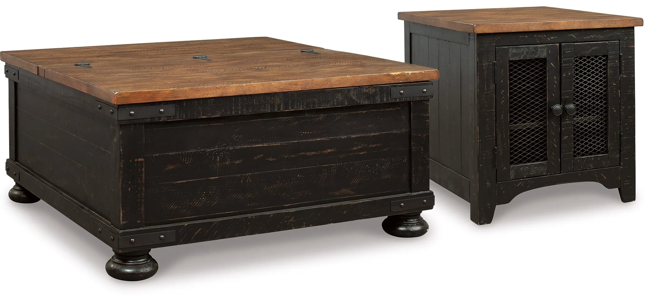 To those with an eye for the best in rustic farmhouse living, this two-tone square coffee table with matching end tables doubles up on form and function. Clever split style design pairs a spring lift top with hinged lid revealing a handy storage compartment. Designer touches include plank-effect styling, distress marks and industrial brackets for added character.