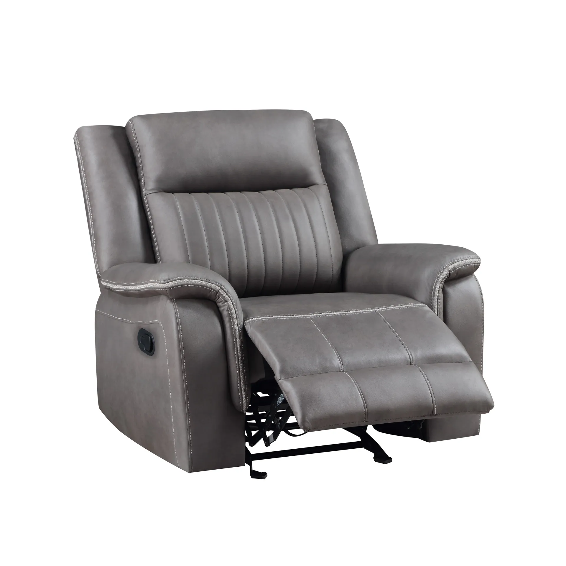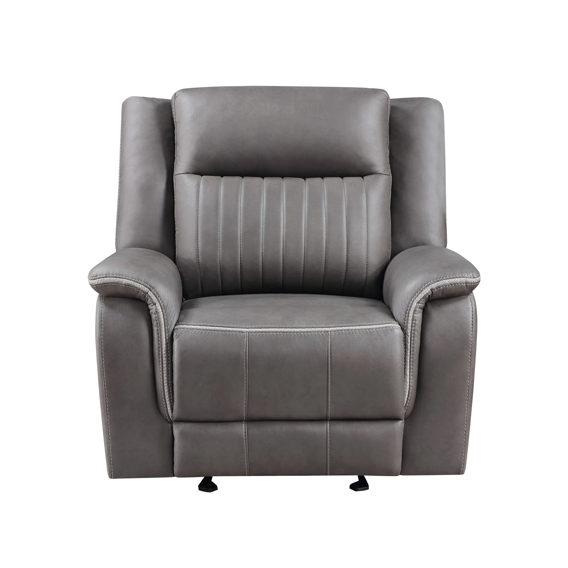Meet the Enzo Glider Recliner, a pinnacle of comfort and style for your living room. Crafted with hardwood and manufactured wood frames, coil spring cushions wrapped in resilient foam and polyester, and no sag seat suspension, this recliner ensures quality seating that promises years of enjoyment. Upholstered in a suede soft 100% polyester gray fabric, it's easy to care for and inviting. The soft gray upholstery features distinctive white contrast stitching, inset cross stitch arm and seat trims, and a luxurious channel back, adding a touch of contemporary elegance to your home. Glide smoothly into relaxation with the recliner's easy gliding action, or indulge in ultimate comfort with its fully upholstered chaise recliner footrest. Upgrade your lounging experience with the Enzo Glider Recliner and enjoy unparalleled comfort and style every day.