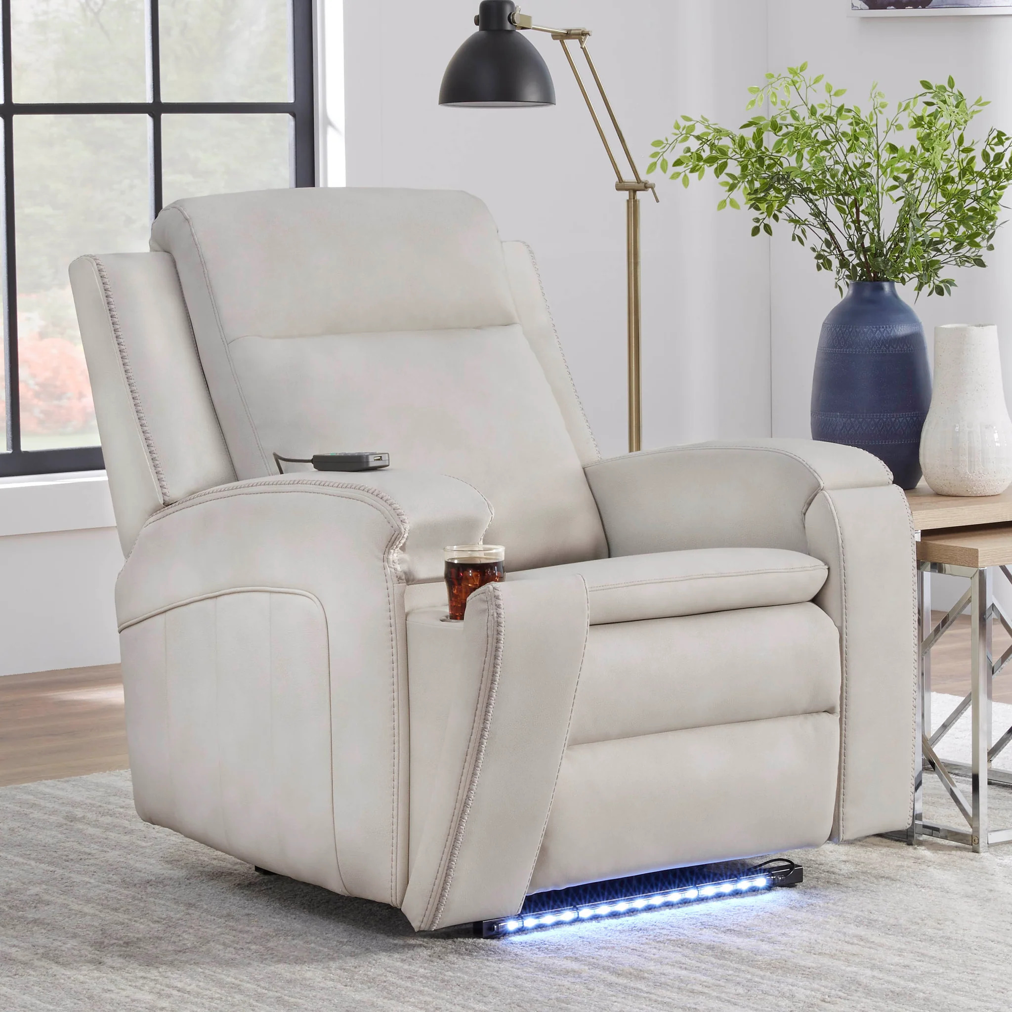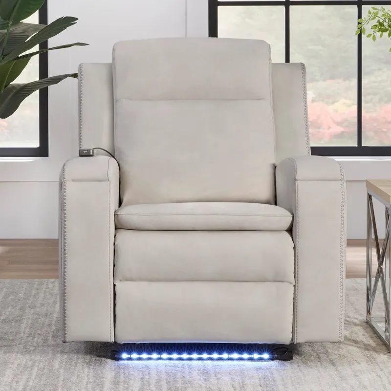 Experience comfort and convenience with the feature-packed Armstrong recliner. Designed with power recline, adjustable lumbar support, and an independent headrest, it adapts to any position. Durable synthetic leather adds a sleek look, while built-in heat, massage, ambient lighting, and smooth gliding motion enhance relaxation. A simple remote puts control at your fingertips.