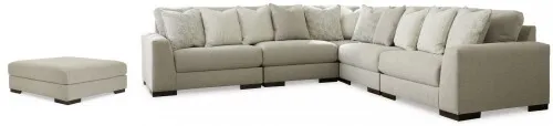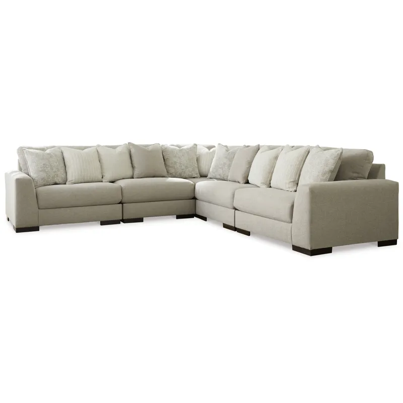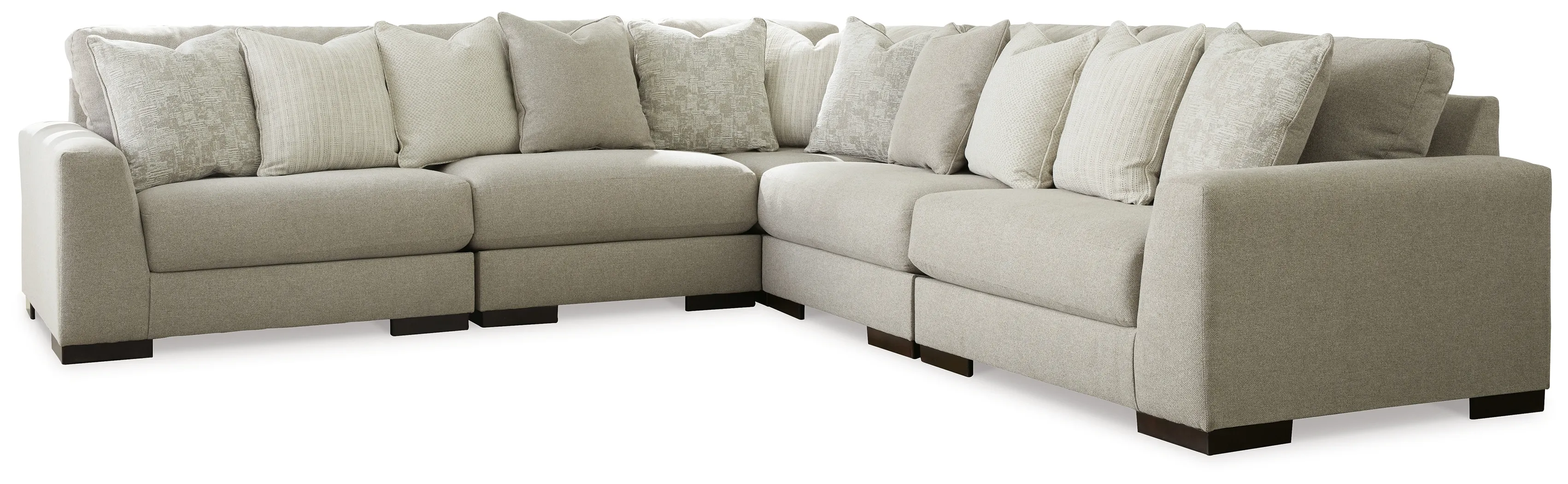 Lyndeboro 5-Piece Sectional (10201S3): 132 x 132 x 39 - Distinguished yet unassuming, this versatile and visually appealing sectional adds a refined touch to any space. Inspired by the dapper look of fine tailored menswear, its rich texture turns heads, while a soft, light gray hue blends effortlessly with other colors in the room. Clean lines and wide track arms embrace a minimalist contemporary style. The sectional's modular design offers a variety of configurations for flexibility. Plush, reversible deep cushions provide extraordinary comfort and can be rotated for longer life. Accent pillows in soft shades of complementary colors add subtle contrast. This handsome piece will make a memorable impression again and again.