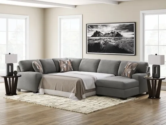 Includes 3 pieces: left-arm facing sofa with corner wedge, armless full sleeper and right-arm facing corner chaise