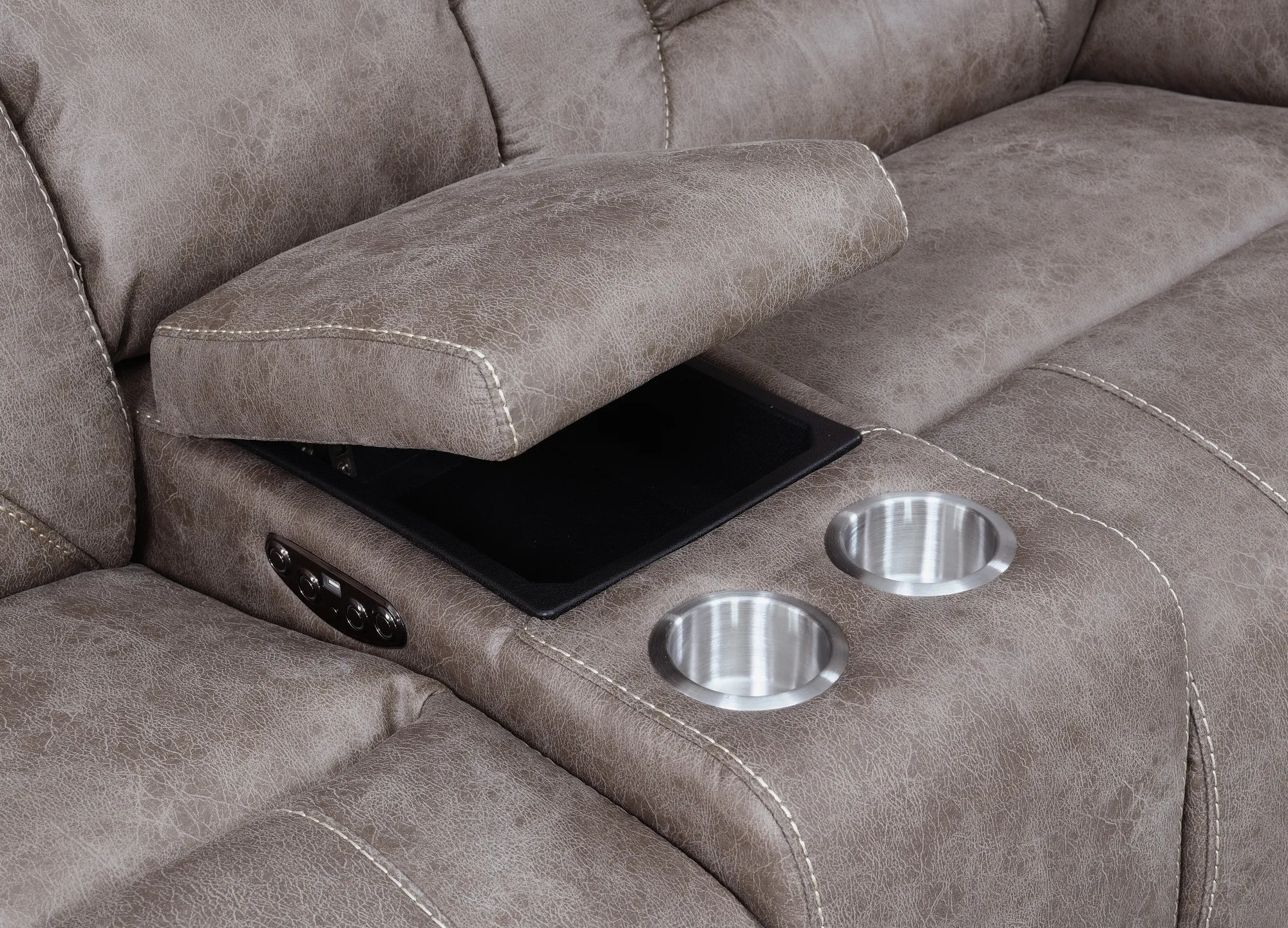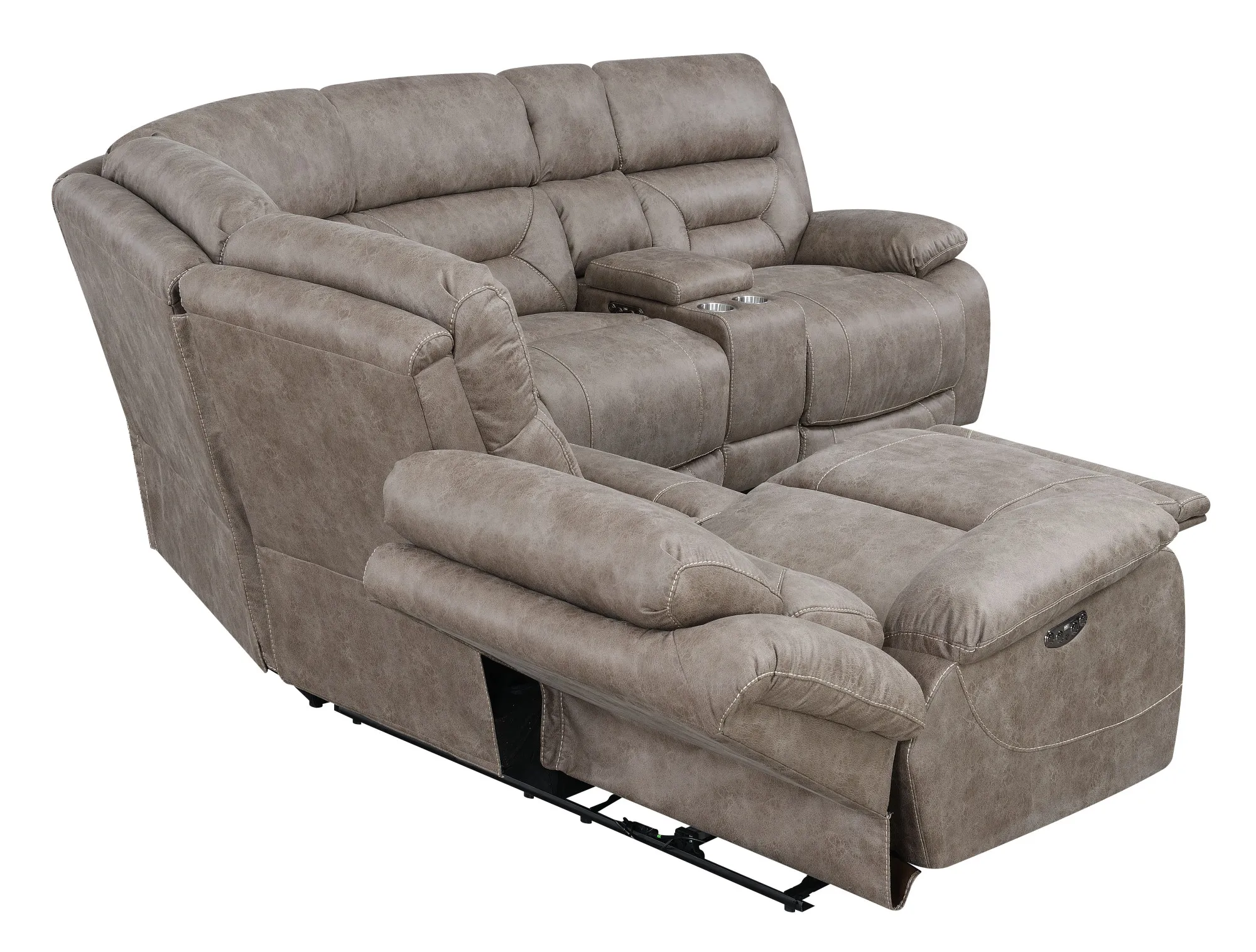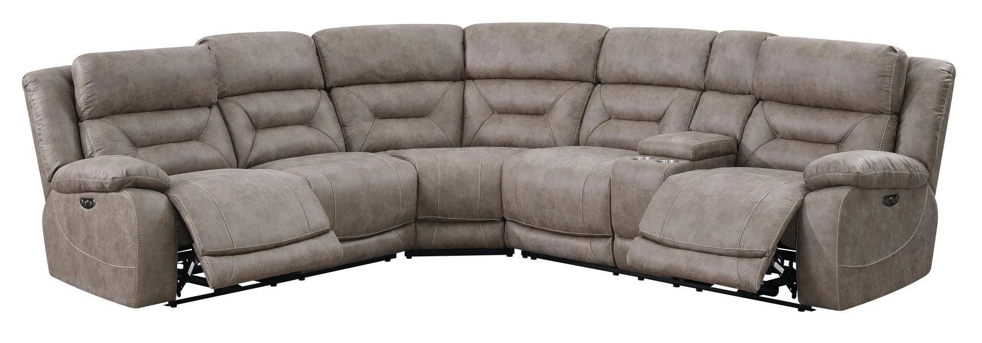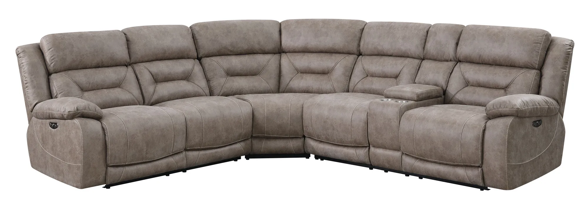 The ultimate in reclining comfort, Aria has power functions built throughout. The Aria 3 Piece Reclining Sectional is upholstered in an easy to clean, soft desert sand material, with gel topped memory foam cushioning for the ultimate in comfort. Features include power footrests and power articulating headrests so you never have to sacrifice comfort to watch your favorite shows. The power control panel features a USB port for recharging devices. Your purchase includes one right arm facing reclining loveseat with console, one left side facing reclining loveseat and one wedge.