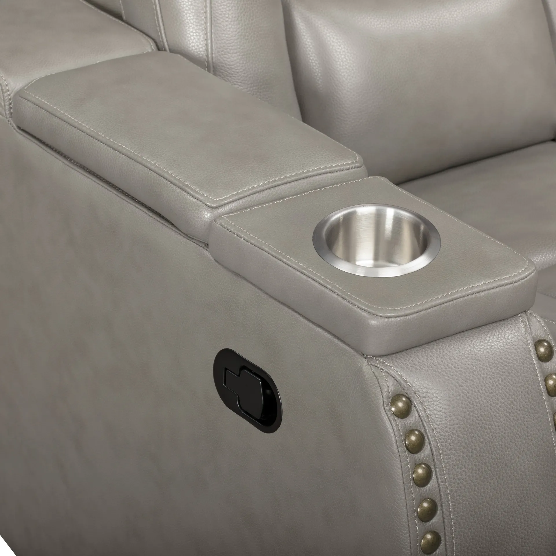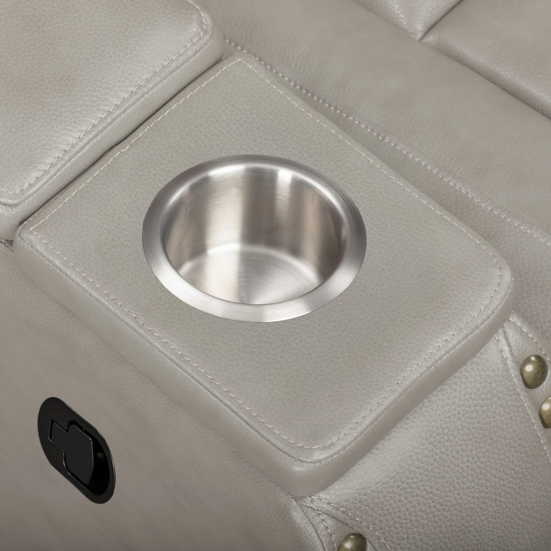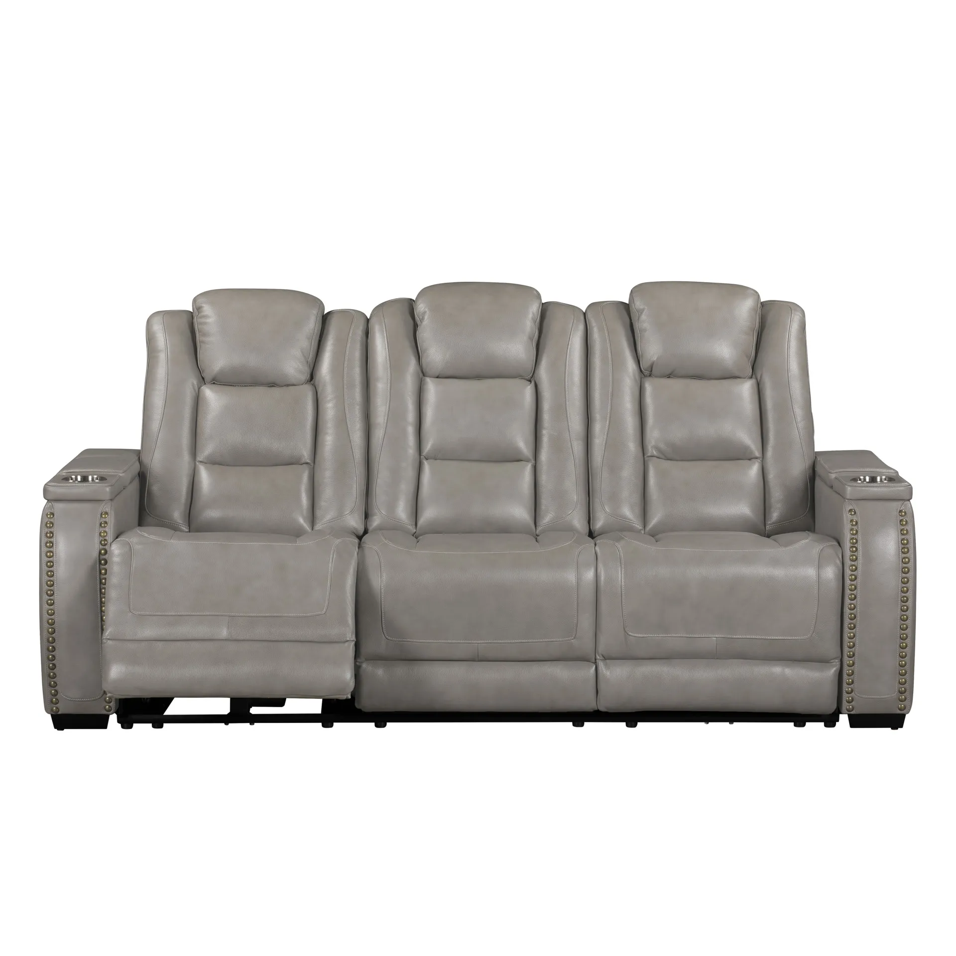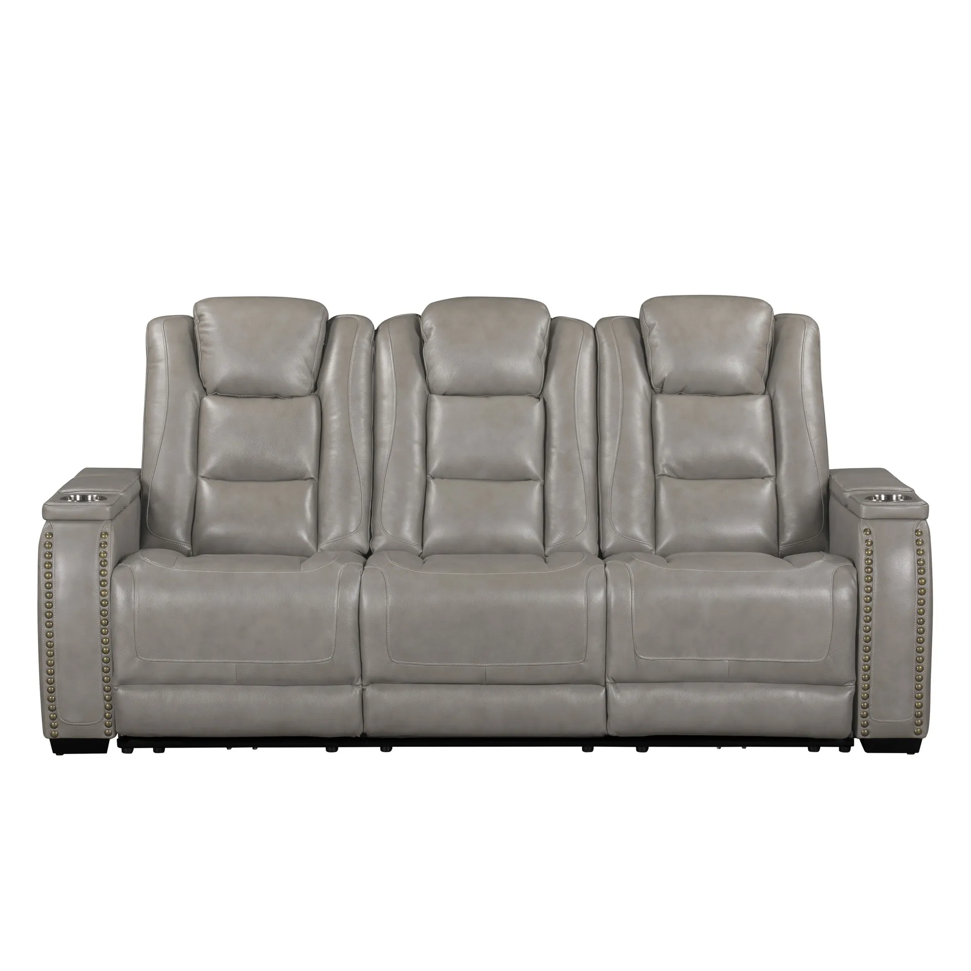 The Breckenridge Genuine Leather Reclining Sofa in Gray offers a perfect combination of luxury, durability, and modern convenience, making it an ideal centerpiece for your living space. This reclining sofa is crafted with a blend of hardwood and manufactured woods, ensuring a sturdy and durable frame that provides long-lasting support and reliability. The top-grain leather on the seats, arms, and footrests delivers a luxurious feel, while a matching leather-like material in less-touched areas keeps it affordable without compromising on style or comfort. The design features clean lines and elegant nailhead trim, blending traditional and contemporary elements for a refined, transitional look. Pocket coil seat cushions provide superior comfort with targeted support, minimizing pressure points for a tailored seating experience. The reclining seats allow you to easily find your perfect position for lounging or reading. This sofa is also packed with convenient features, including cupholders integrated into the armrests. Additionally, the sofa includes a drop-down tray, electrical outlets, and reading lights, making it a functional and stylish addition to any home.