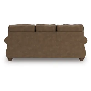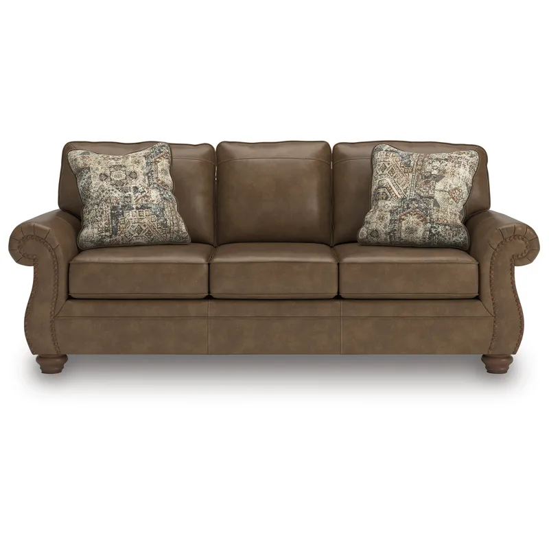 Everyone can have the best seat in the house with this sofa. Its nailhead trim puts the finishing touches on the traditional roll arms you love. Comfy, durable cushions—wrapped in a rustic yet sophisticated faux leather—keep you feeling relaxed. Chenille pillows in a distressed motif pattern add another layer of comfort. And the sofa's turned legs show that style and quality flow from top to bottom.