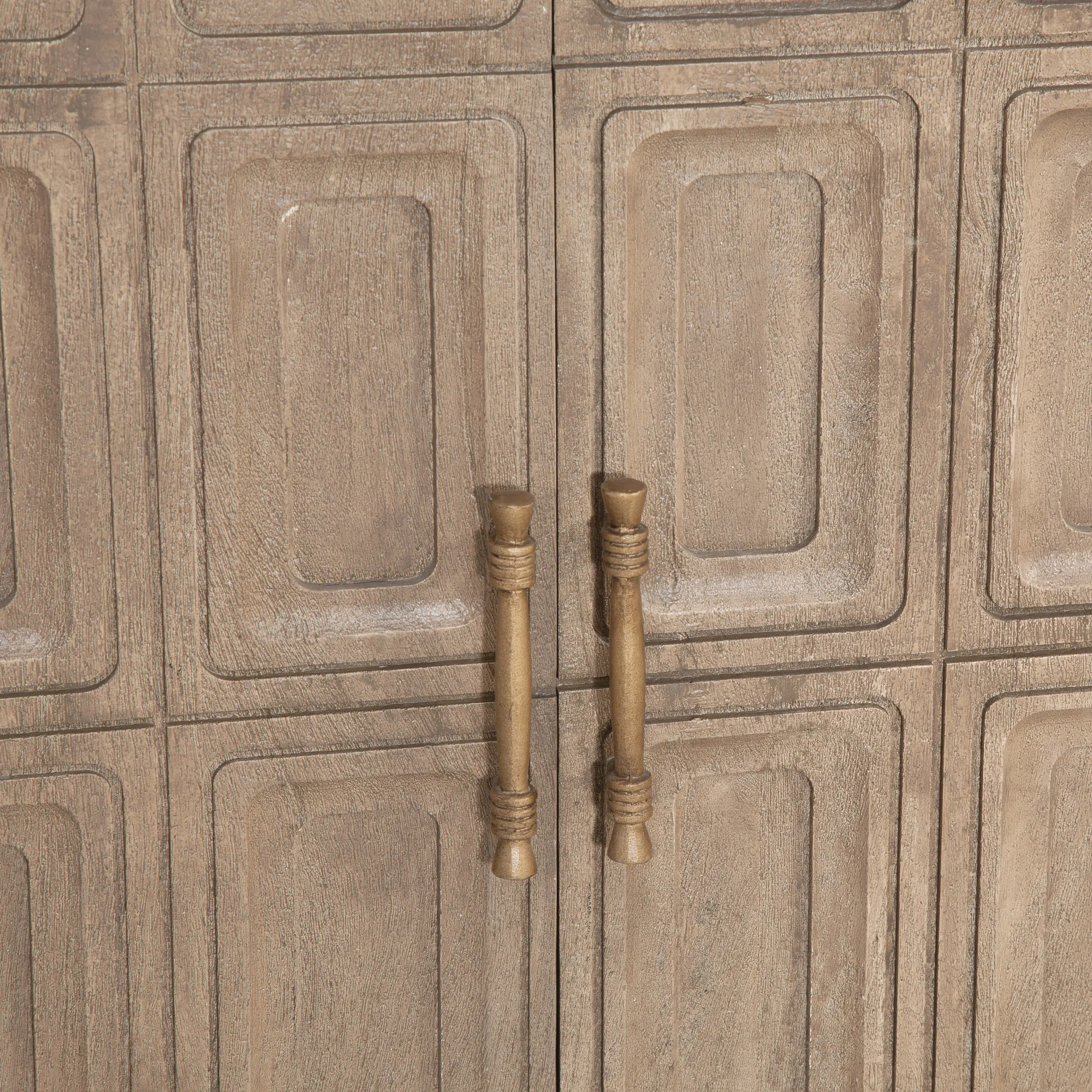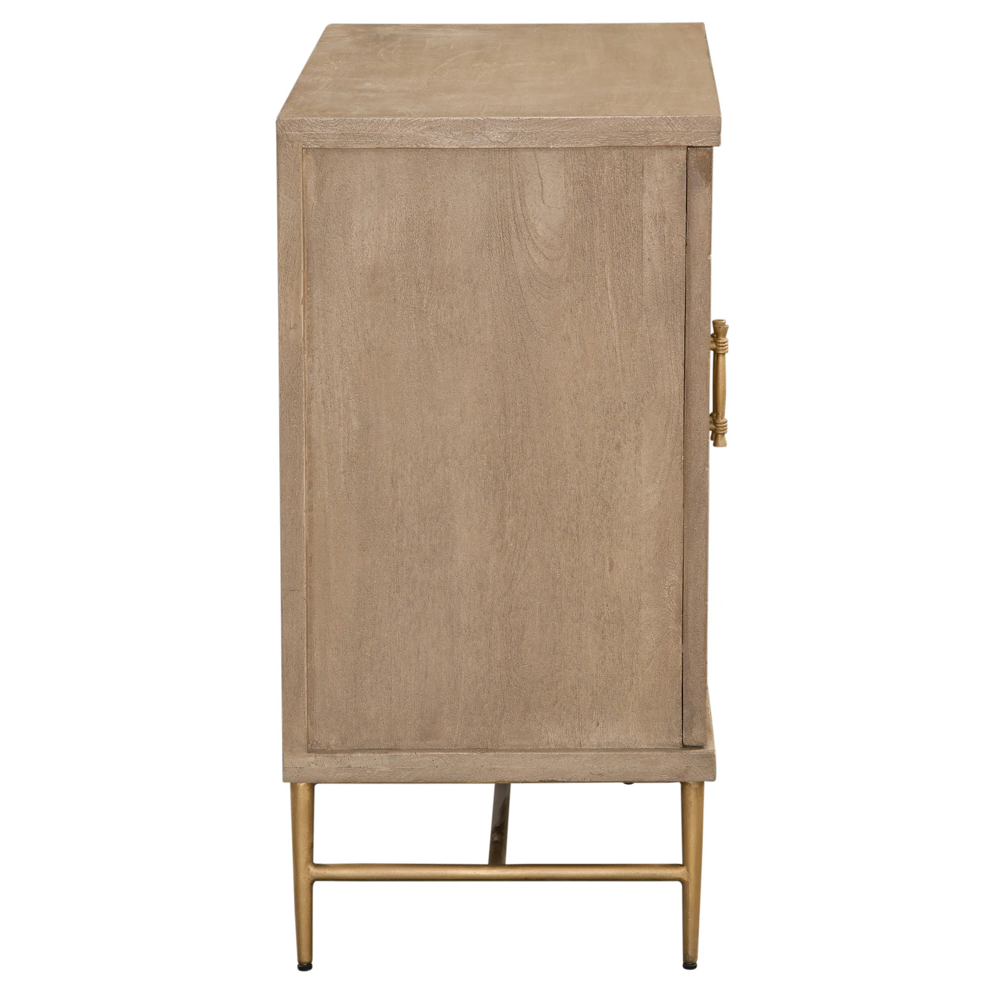 The Arrun Cabinet combines timeless design with exceptional craftsmanship. Featuring recessed rectangular panels, it adds depth and dimension to its surface. Crafted from solid mango wood with a distressed driftwood finish, it offers rustic charm, natural durability, and valuable storage. The iron handles and metal base, finished in antiqued gold with wrapped details, add a refined, artisanal touch. Blending vintage allure with modern sophistication, the Arrun Cabinet adds a touch of rustic elegance with eclectic flair to any room.