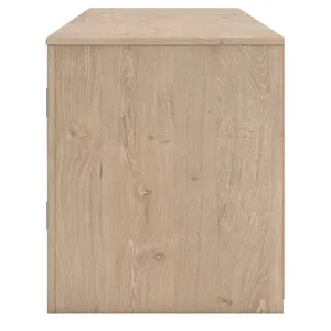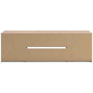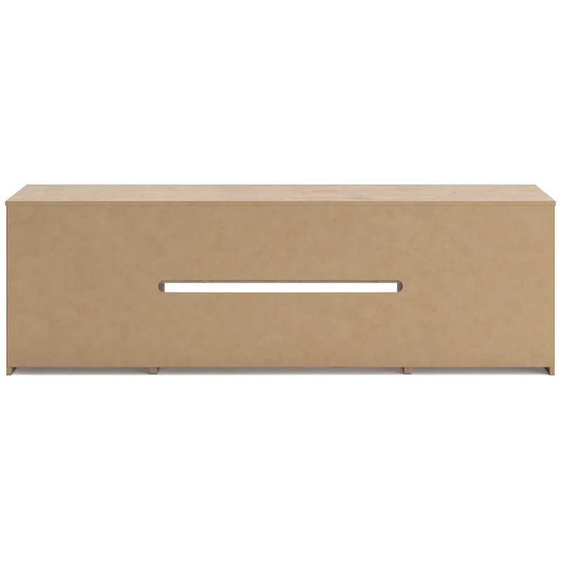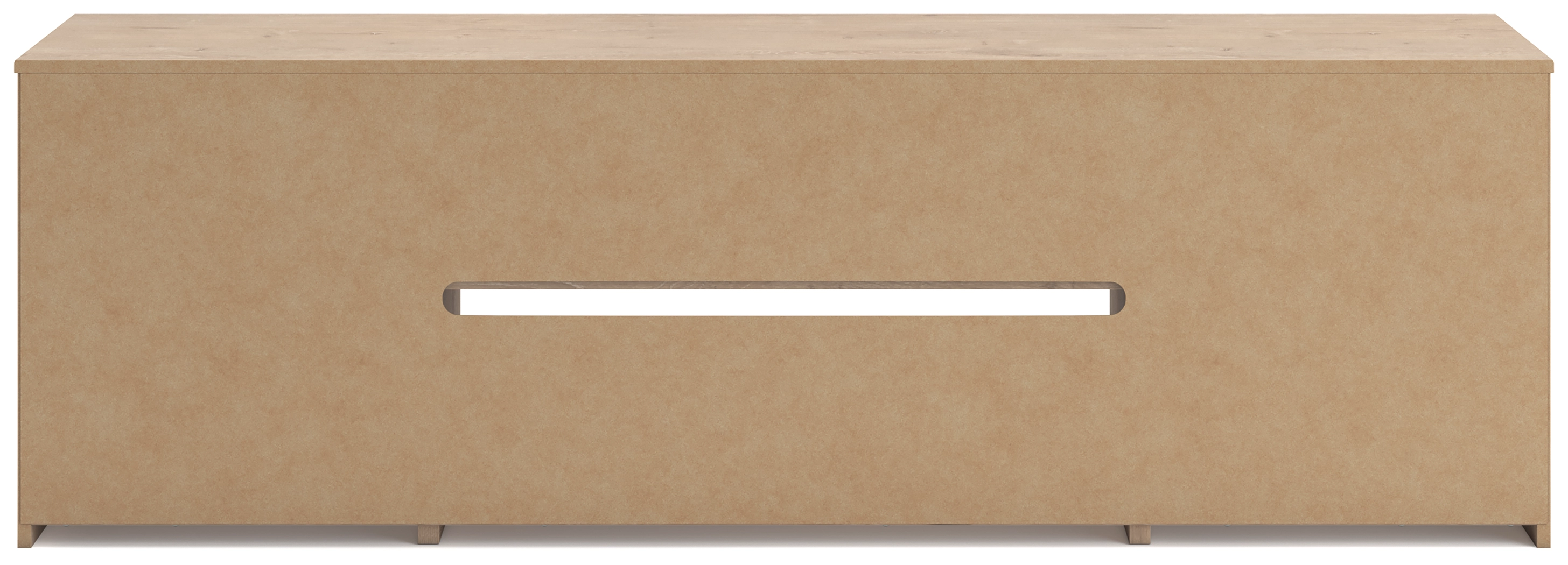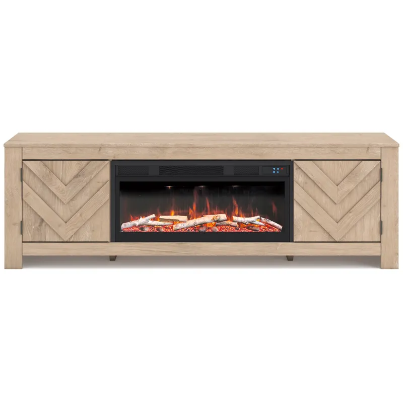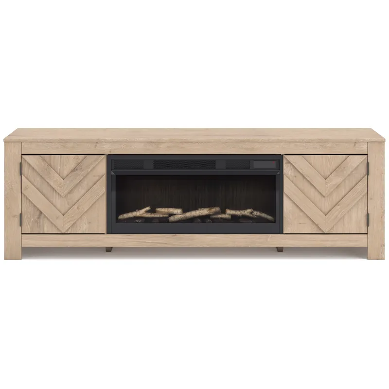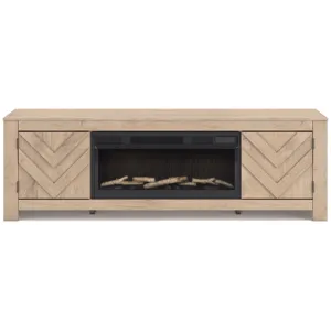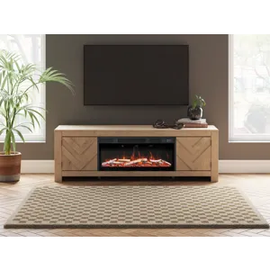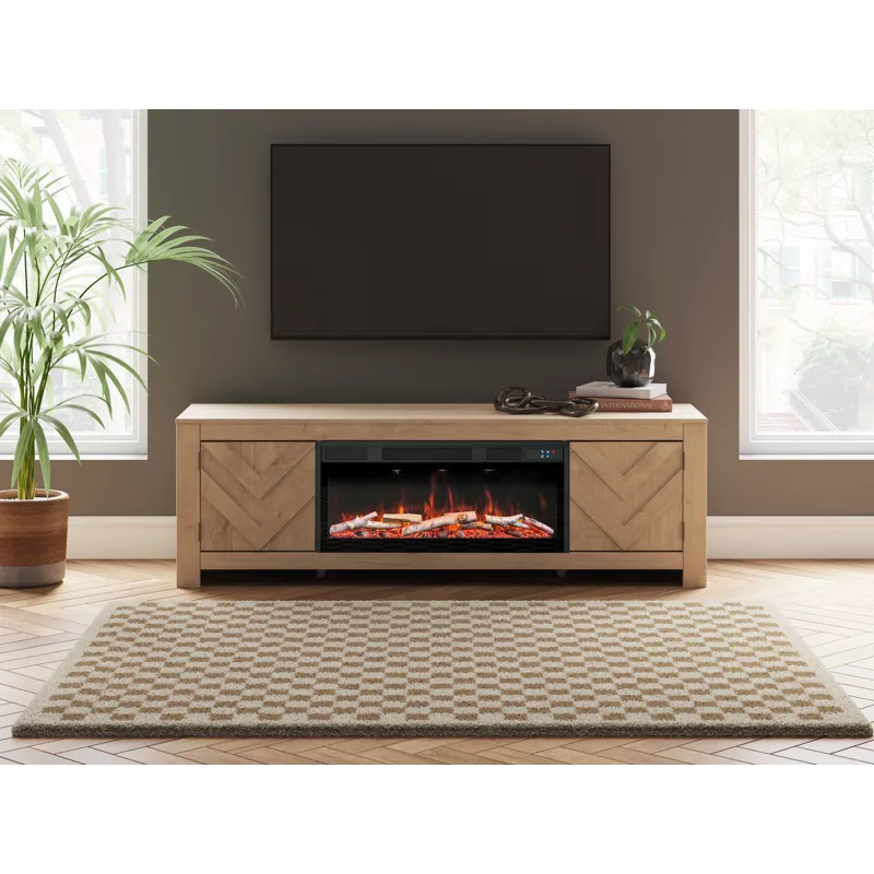 This TV stand with electric fireplace embraces a classically charming aesthetic and repurposes it for modern living. Its light replicated wood grain appeals to your love of vintage character, while the chic chevron pattern is effortlessly on trend. Media accessories stay tucked away in style with hidden storage behind the doors. And for added ambiance, the electric fireplace brings a cozy-cool vibe to your living room. With the touch of a button, activate the LED-lit flame and adjust the temperature or the flame brightness. The flame effect includes multiple color options and a realistic-looking faux birch log set.