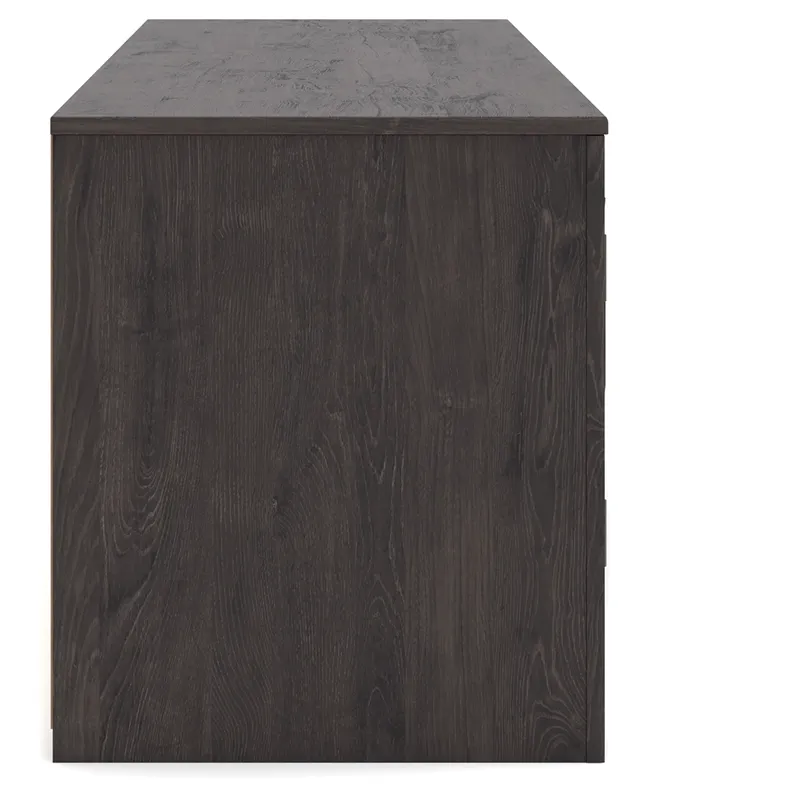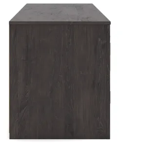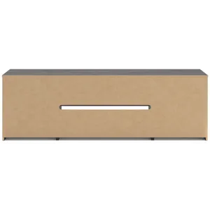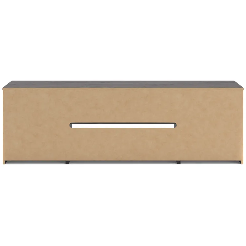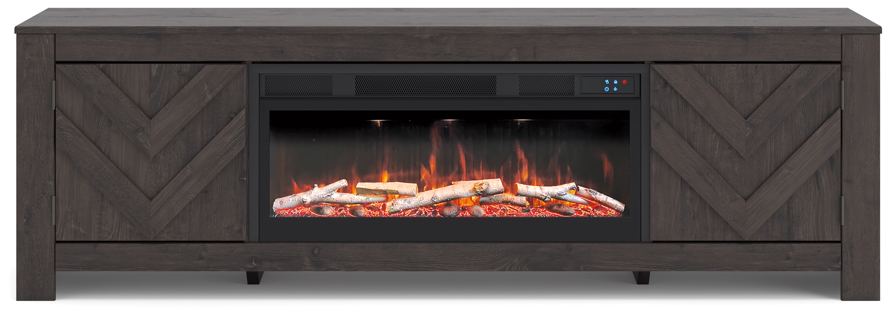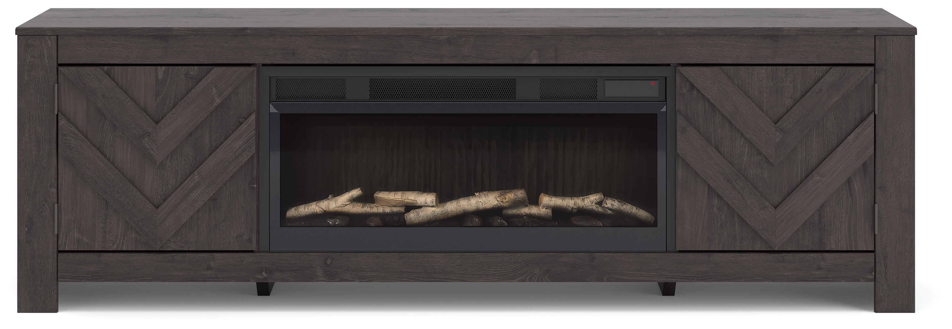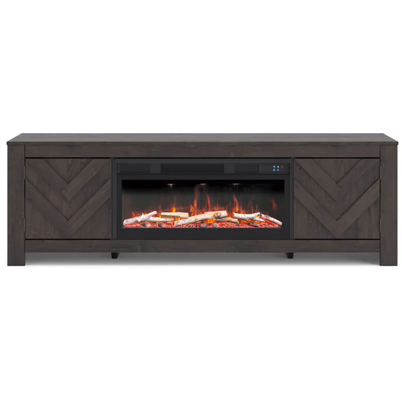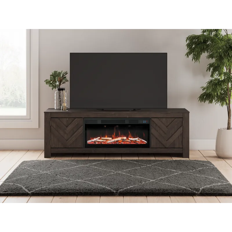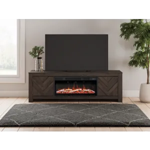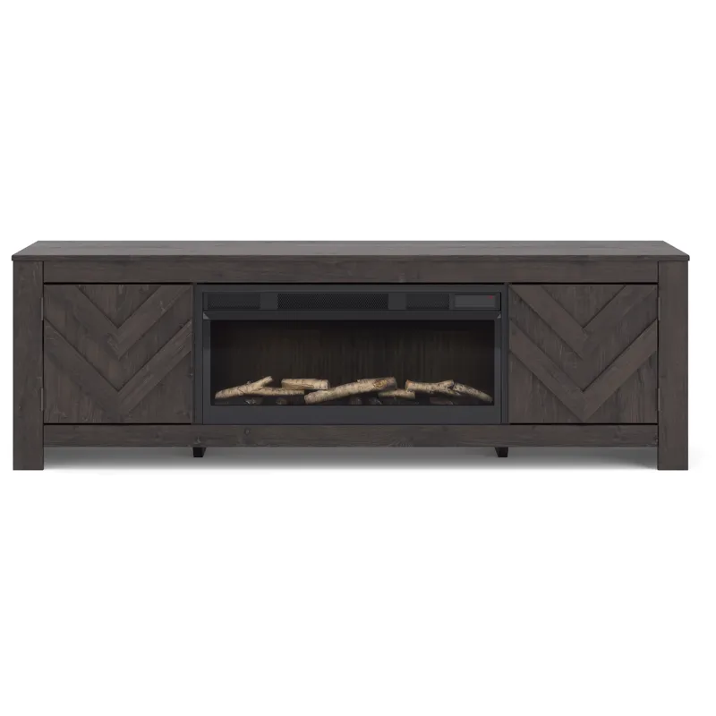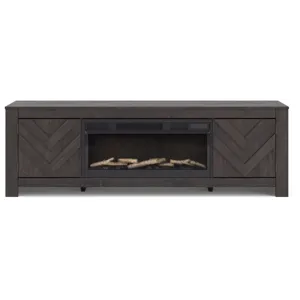This TV stand with electric fireplace embraces a classically charming aesthetic and repurposes it for modern living. Its dark charcoal finish appeals to your love of vintage character, while a chic chevron pattern is effortlessly on trend. Media accessories stay tucked away in style thanks to hidden storage behind the doors. And for added ambiance, the electric fireplace brings a cozy-cool vibe to your living room. With the touch of a button, activate the LED-lit flame and adjust the temperature or the flame brightness. The flame effect includes multiple color options and a realistic-looking faux birch log set.
