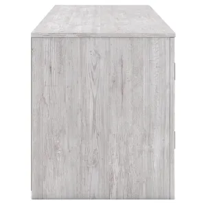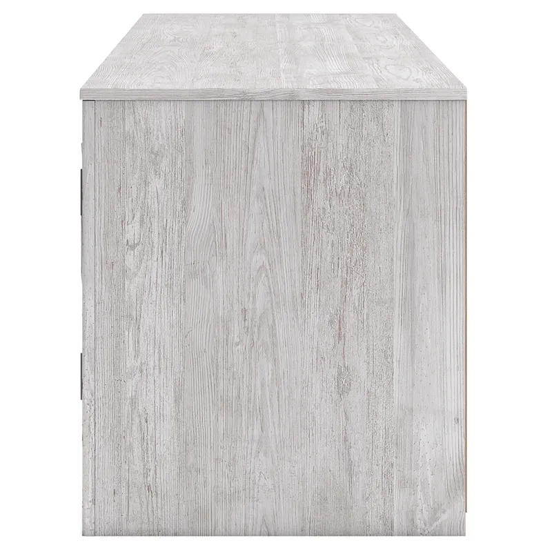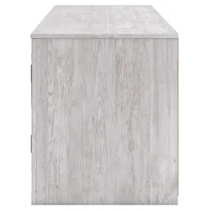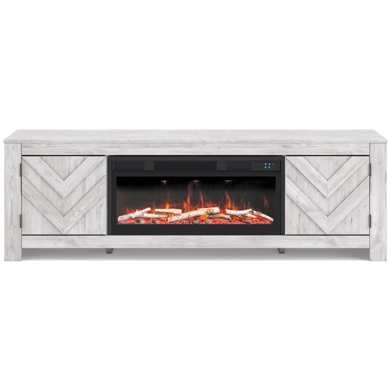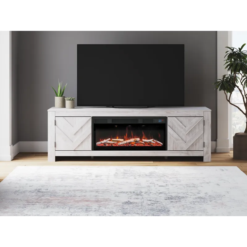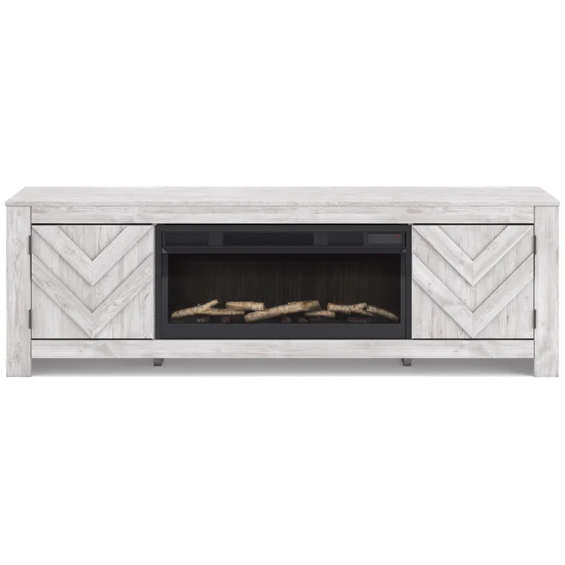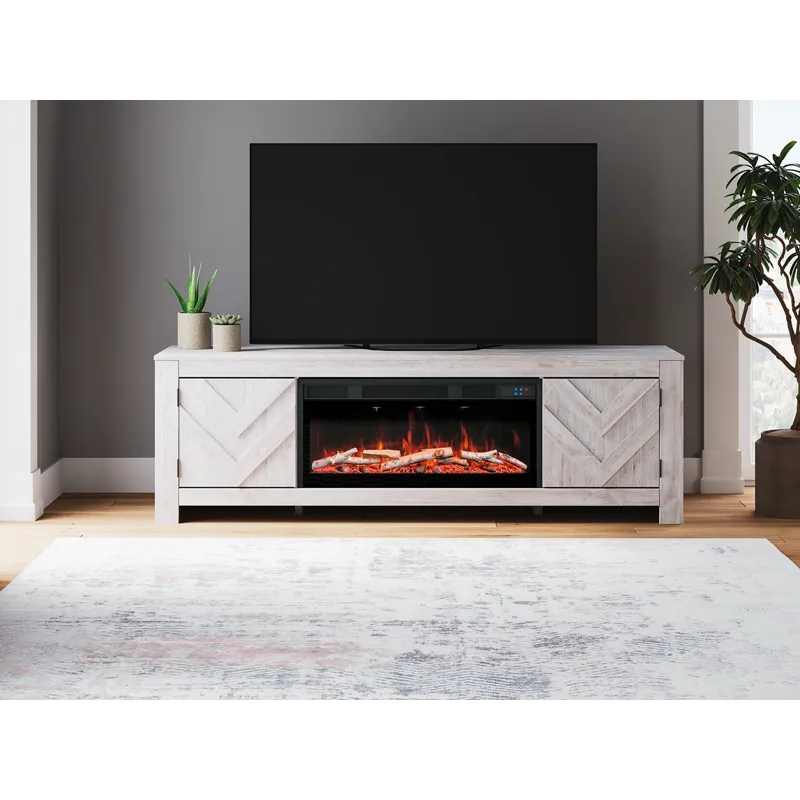 This TV stand with electric fireplace embraces a classically charming aesthetic and repurposes it for modern living. Its whitewash replicated paint appeals to your love of vintage character, while the chic chevron pattern is effortlessly on trend. Media accessories stay tucked away in style thanks to hidden storage behind the doors. And for added ambiance, the electric fireplace brings a cozy-cool vibe to your living room. With the touch of a button, activate the LED-lit flame and adjust the temperature or the flame brightness. The flame effect includes multiple color options and a realistic-looking faux birch log set.