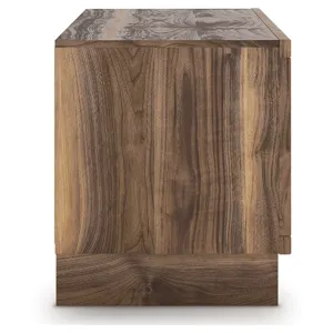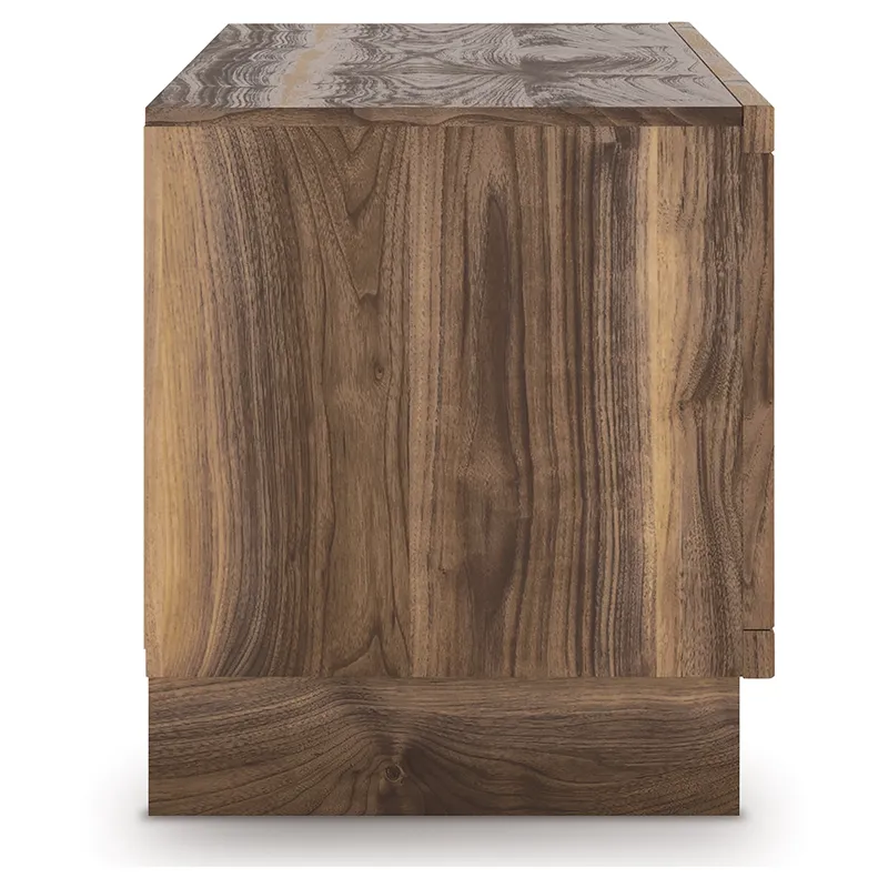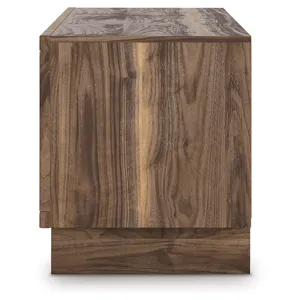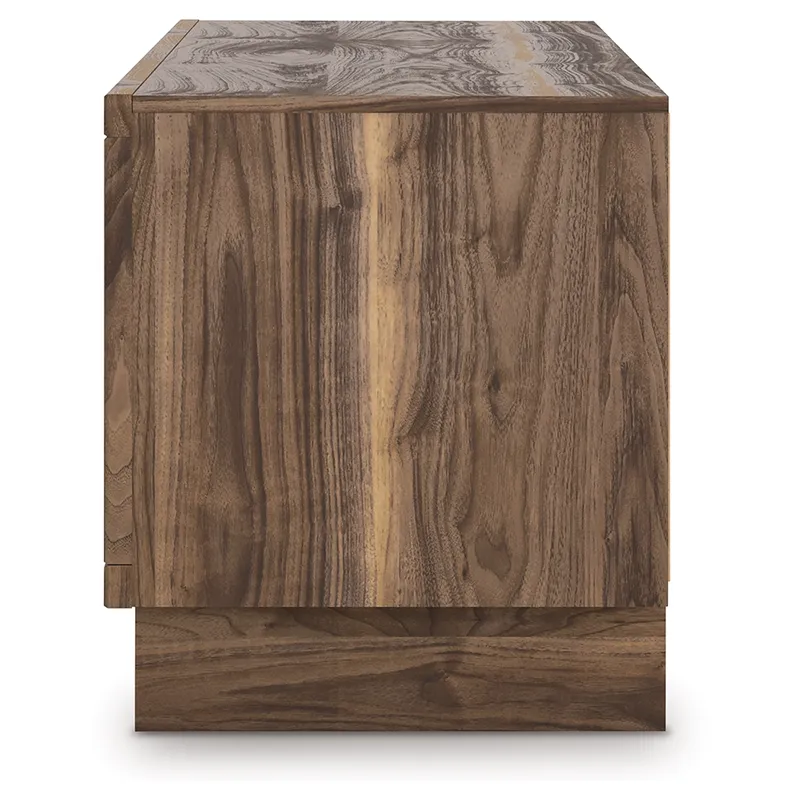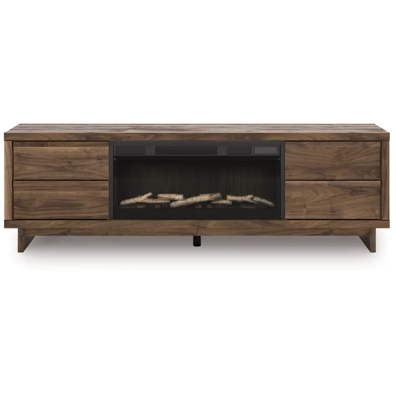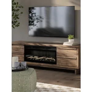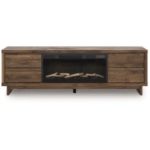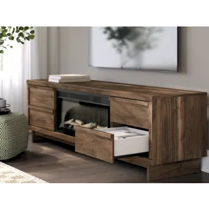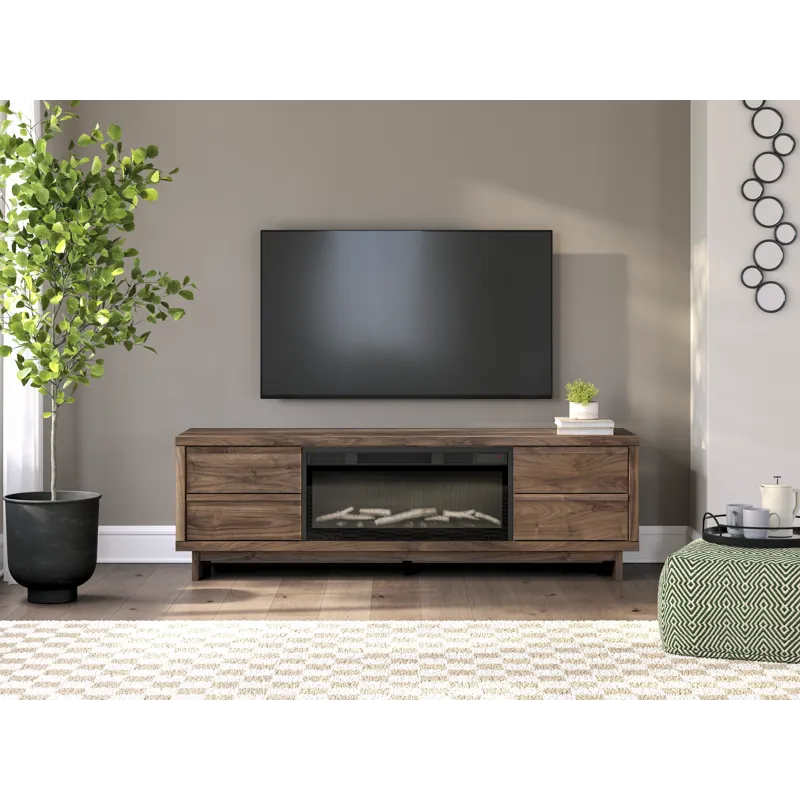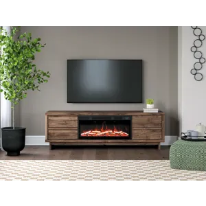 Nostalgic style, retooled for today’s trends. This TV stand with electric fireplace puts an elevated twist on mod aesthetics. Its warm brown tones reflect the mid-century vibes you love, while the angular base incorporates contemporary motifs. Integrated drawer handles round out the look in sleek style. For added ambiance, the electric fireplace brings a cozy-cool vibe to your living room. With the touch of a button, activate the LED-lit flame and adjust the temperature or the flame brightness. The flame effect includes multiple color options and a realistic-looking faux birch log set.