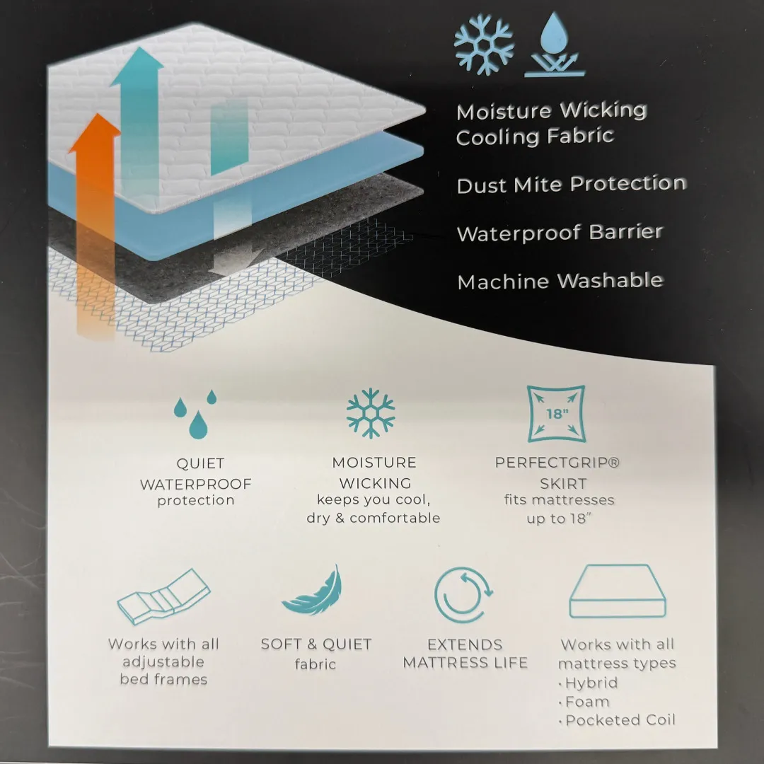 Keep your cool all night long with this twin mattress protector. Crafted with moisture-wicking fabric, it keeps you dry and comfortable while remaining cool to the touch. The result: a truly satisfying sleep experience that naturally helps regulate your body temperature for maximum recovery and rejuvenation. The quiet waterproof invisible barrier repels liquids and protects against dust mites so you can truly rest easy.