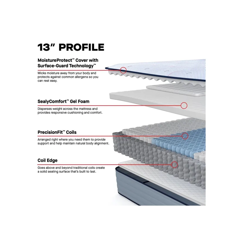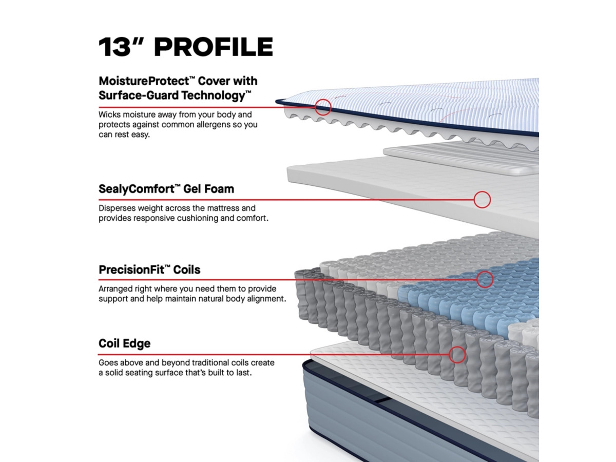 SealyComfort™ & SealySupport™ Gel Foams: These foam layers provides cushioning, comfort and contributes to the foundational support of the mattress.