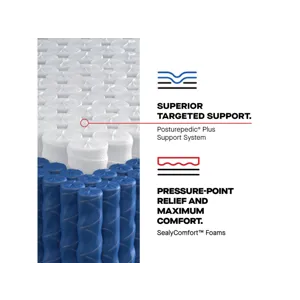 Posturepedic® Plus Support System: The Posturepedic® Plus Support System features our exclusive PrecisionFit™ Coils, arranged right where you need them to help maintain natural body alignment and reduce nagging Bed Aches™. This support system is surrounded by a DuraFlex™ Coil Edge for a solid seating surface that’s more durable and flexible when paired with an adjustable base.