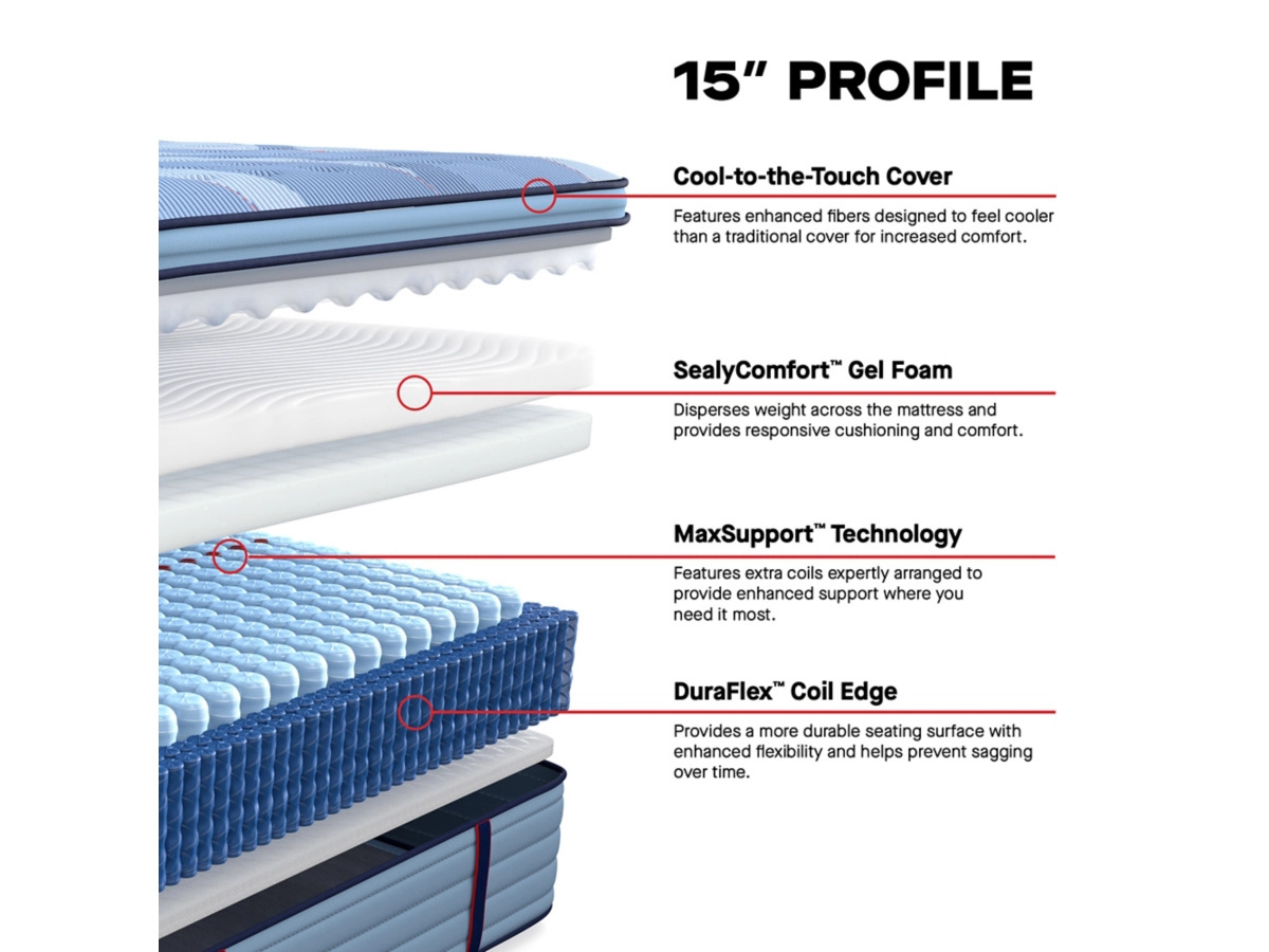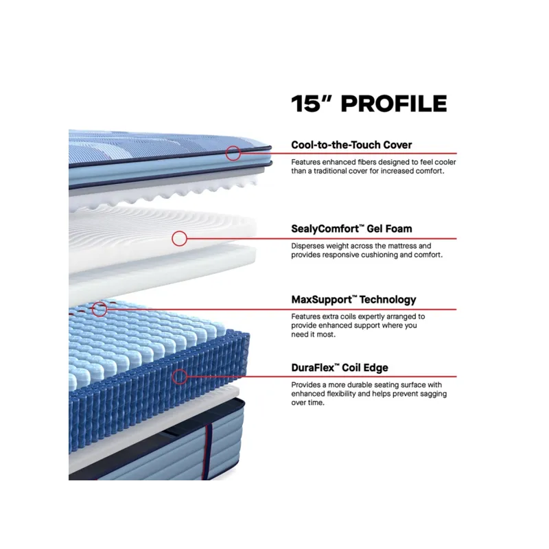 SealyComfort™ & SealySupport™ Gel Foams: These foam layers provides cushioning, comfort and contributes to the foundational support of the mattress.